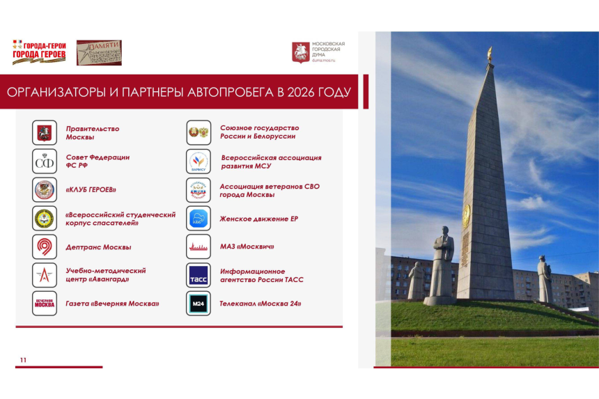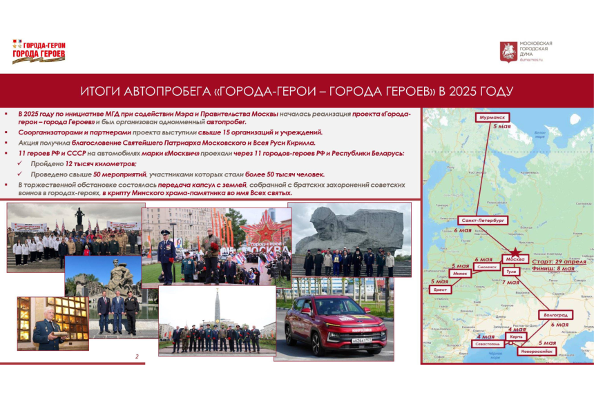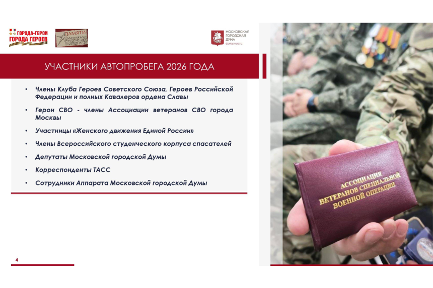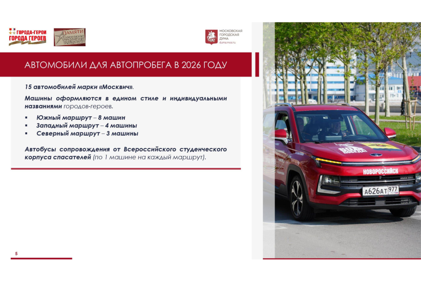 Основными участниками автопробега станут герои СССР и Российской Федерации, в том числе ветераны специальной военной операции. Как и в прошлом году, автопробег пройдет на автомобилях марки «Москвич».