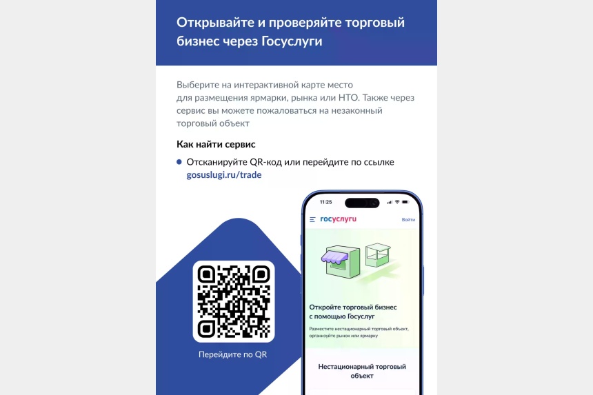 На интерактивной карте https://www.gosuslugi.ru/trade на «Госуслугах» можно увидеть все законные места, выделенные под нестационарную торговлю и ярмарки, а также розничные рынки. Владельцы торговых точек могут разместить на них QR-код, которые ведет на персональные страницы их торговых объектов на «Госуслугах» – он будет подтверждать, что они работают законно.