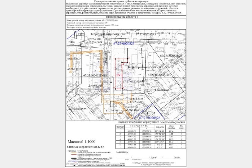Администрация города Смоленска, рассмотрев ходатайство МУП «Смоленсктеплосеть» об установлении публичного сервитута в целях складирования строительных и иных материалов, возведения некапитальных строений, сооружений (включая ограждения, бытовки, навесы) и (или) размещения строительной техники, которые необходимы для обеспечения строительства, реконструкции, ремонта инженерных сооружений, уведомляет о возможном установлении публичного сервитута в предложенных границах в отношении земельного участка с кадастровым номером 67:27:0020525:698, адрес: РФ, Смоленская область, городской округ город Смоленск, город Смоленск, улица Нормандия-Неман, дом 14, указанных на прилагаемом к ходатайству графическом описании местоположения границ публичного сервитута.