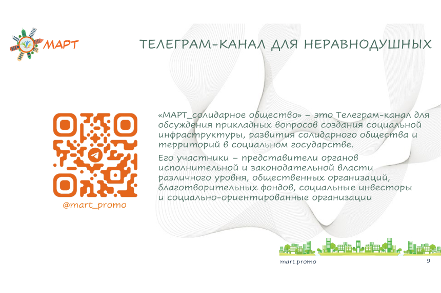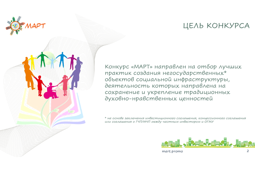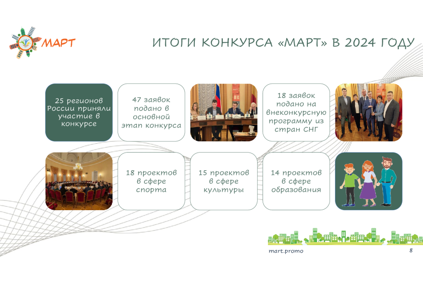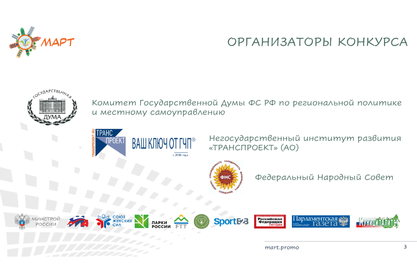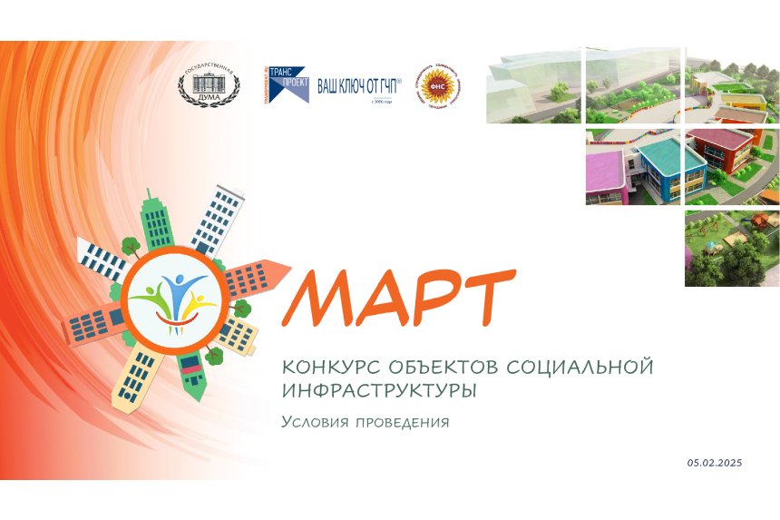 Комитет Государственной Думы ФС РФ по региональной политике и местному самоуправлению, Негосударственный институт развития «ТРАНСПРОЕКТ» (АО) и Федеральный Народный Совет выступают организаторами Всероссийского конкурса объектов социальной инфраструктуры «МАРТ» по выявлению лучших практик сохранения и укрепления традиционных ценностей. В 2024 г. в конкурсе «МАРТ» приняли участие 47 проектов из 25 субъектов РФ, в том числе 18 зарубежных.