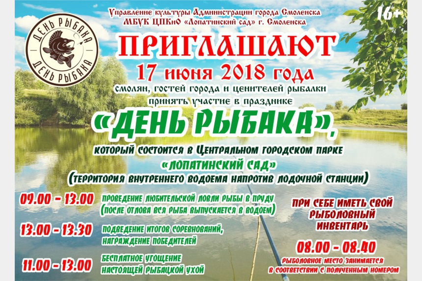 Местом проведения мероприятия традиционно станет пруд в Лопатинском саду. У смолян и гостей города будет отличная возможность посостязаться в рыбной ловле, а также отведать свежесваренной ухи и просто весело провести время.