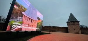 Экран установлен у восточного участка крепостной стены – на благоустроенной летом территории