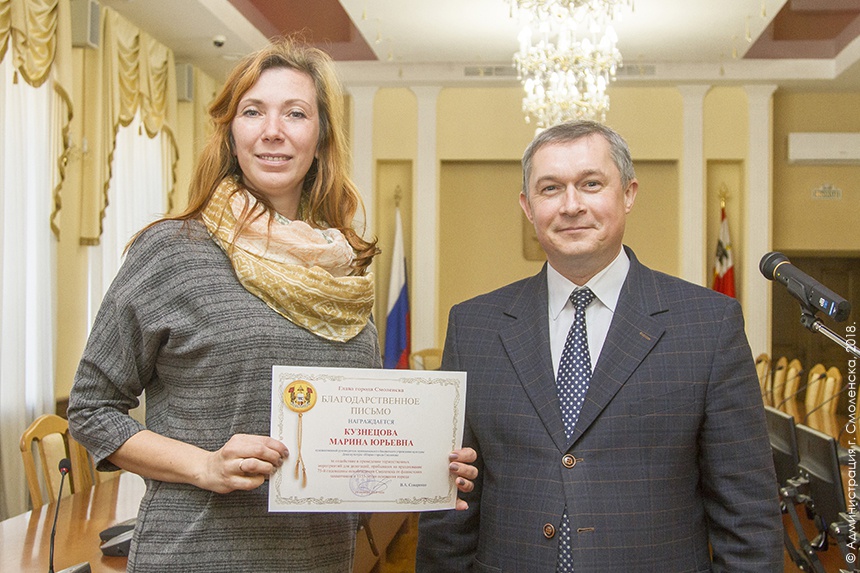 Также смоляне были награждены Благодарственными письмами Главы города Смоленска за активное участие в подготовке и проведении торжественных мероприятий, посвященных 75-й годовщине освобождения Смоленска от фашистских захватчиков и 1155-летию основания города: