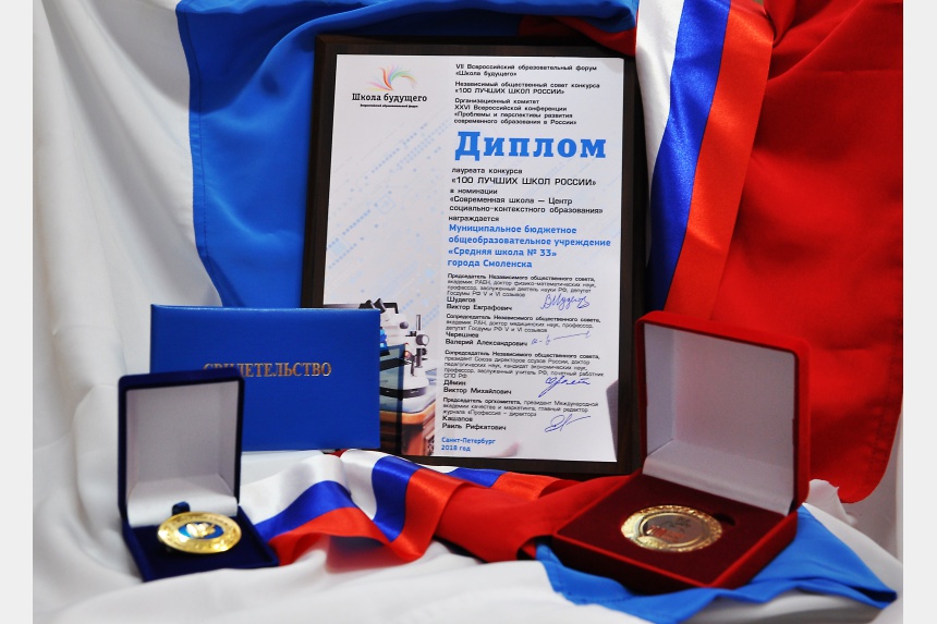 В шестой раз подряд «Средняя школа № 33» города Смоленска стала лауреатом конкурса «100 лучших школ России» в номинации «Современная школа – Центр социально-контекстного образования» и награждена золотой медалью. Руководитель образовательной организации, почетный член Международной академии качества и маркетинга Сергей Жойкин в очередной раз награждён почетным знаком и удостоен звания «Директор года – 2018».