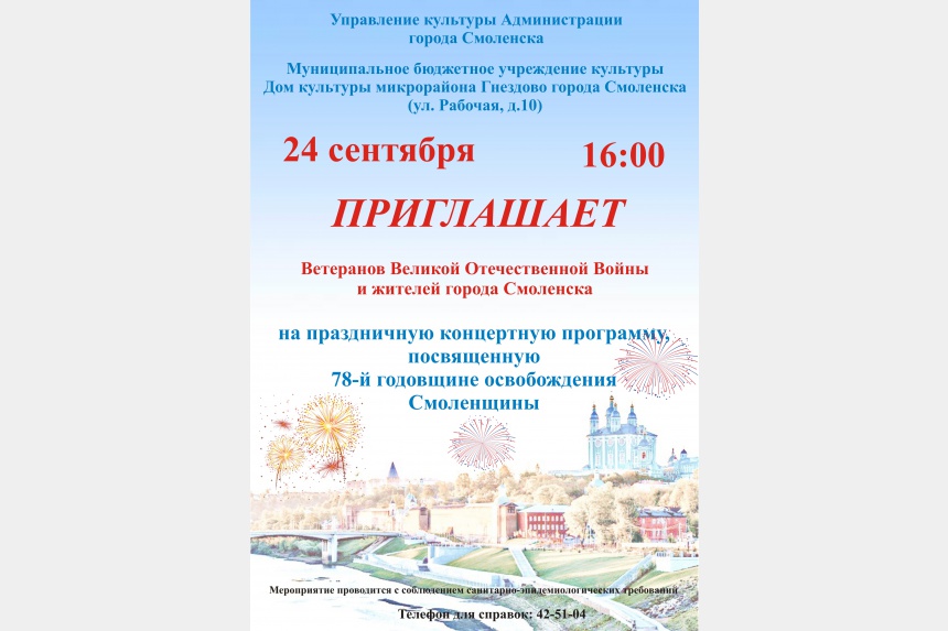 11:30 – концерт «Стороны родной Смоленской памятный мотив», посвященный Дню освобождения Смоленска