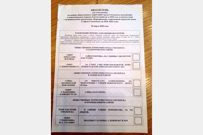 Стоит отметить, что параллельно выборам главы государства проходит рейтинговое голосование, в ходе которого горожане определяют общественные территории Смоленска, нуждающиеся в благоустройстве в первую очередь. Для этого во всех зданиях, где находятся участковые избирательные комиссии, расположены отдельные специальные зоны для голосования по скверам. Принять участие в этой процедуре может любой желающий гражданин, достигший 14-летнего возраста и имеющий паспорт.