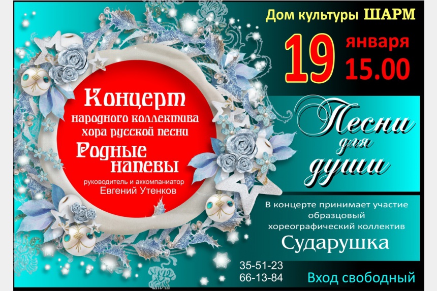 Концерт народного коллектива хора русской песни «Родные напевы» и образцового хореографического коллектива «Сударушка» пройдет 19 января в муниципальном Доме культуры «Шарм».