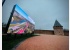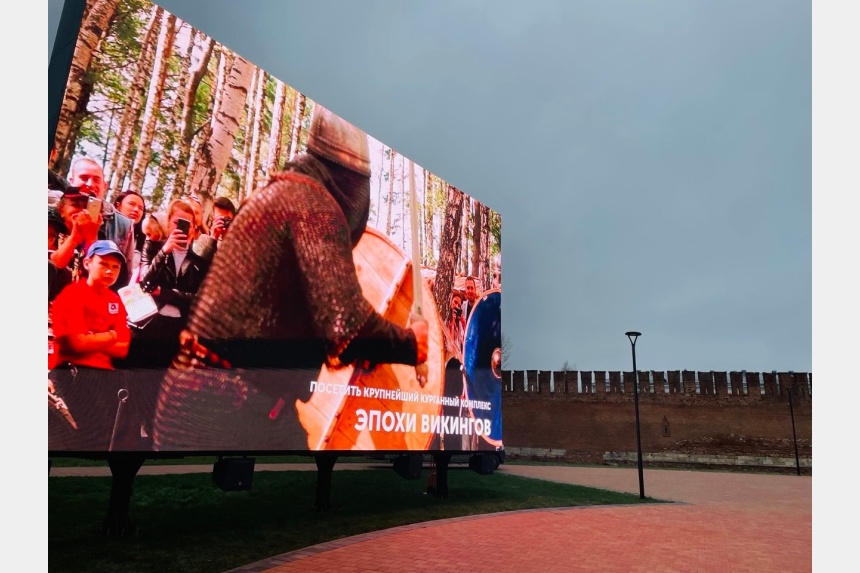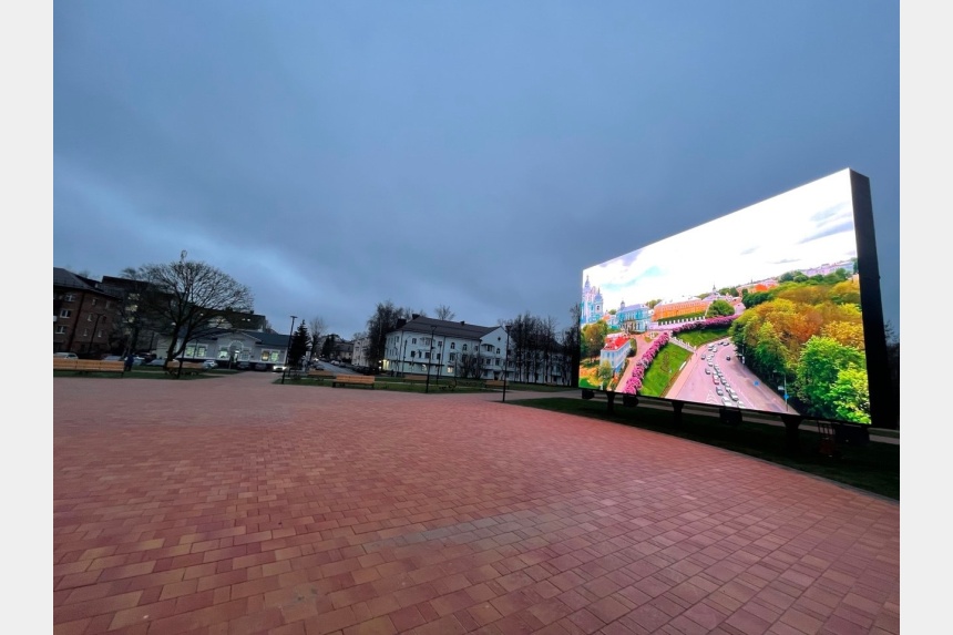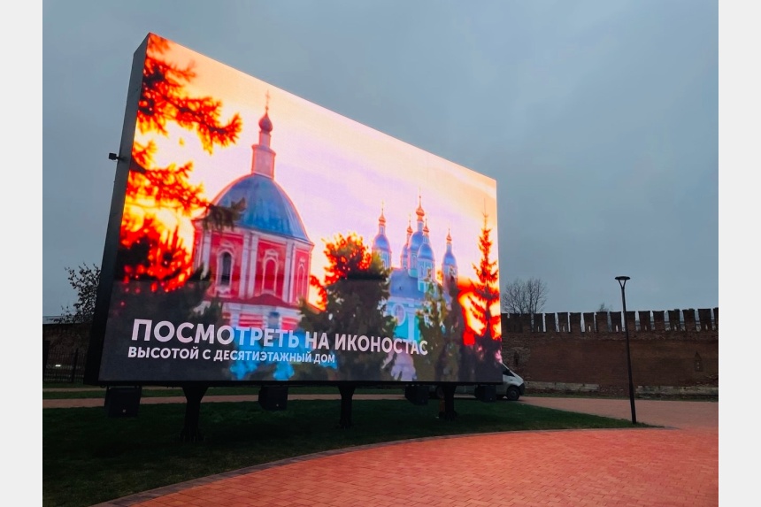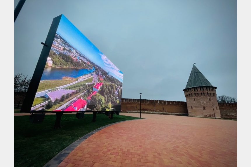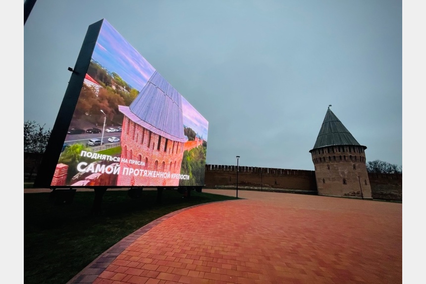 Экран установлен у восточного участка крепостной стены – на благоустроенной летом территории.