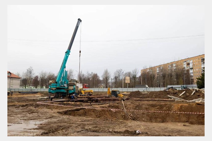 Сейчас на объекте осуществляется устройство свайного основания. Уже погружено 513 свай на расчётную глубину. Параллельно решаются вопросы инженерной инфраструктуры: вынос ливневой канализации, переподключение к сетям.