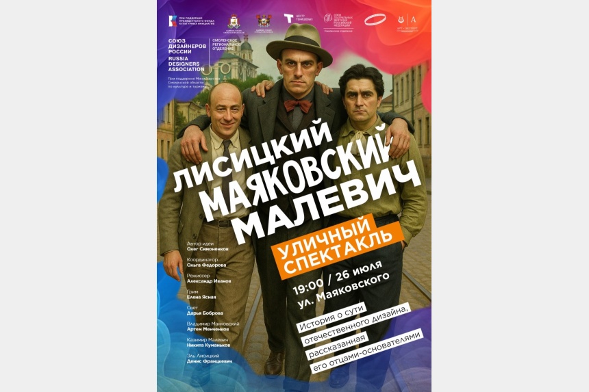 В рамках иммерсивного театрального представления профессиональные актеры воплотят образы трех ключевых фигур авангарда: Владимира Маяковского (Артем Менченков), Казимира Малевича (Никита Куманьков) и Эля Лисицкого (Денис Францкевич).