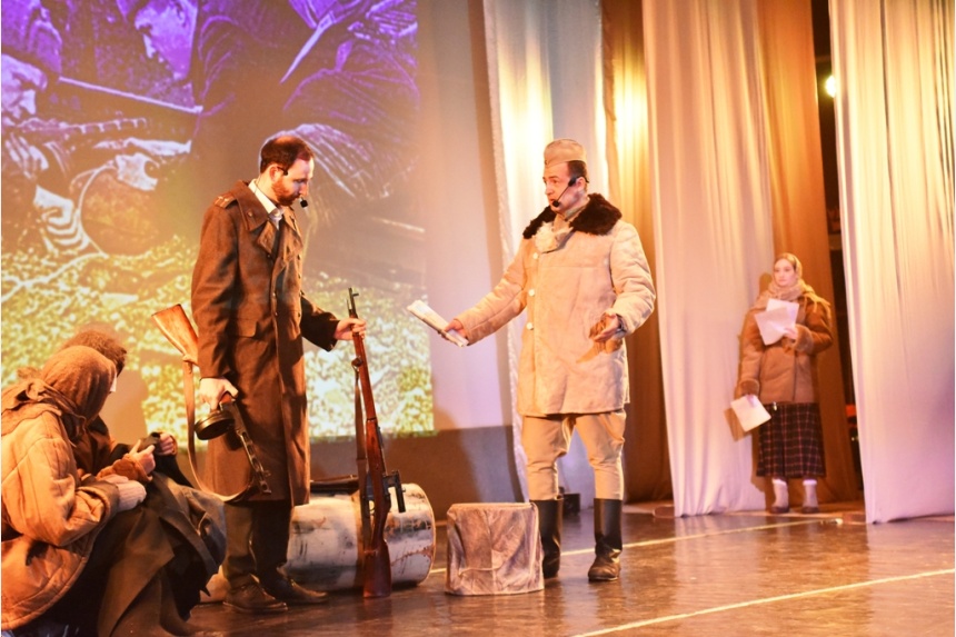 В зрительном зале в театрализованных эпизодах перелистались страницы довоенного и военного времени по поэмам А.Т. Твардовского, демонстрировались документальные кадры хроники специальной военной операции.