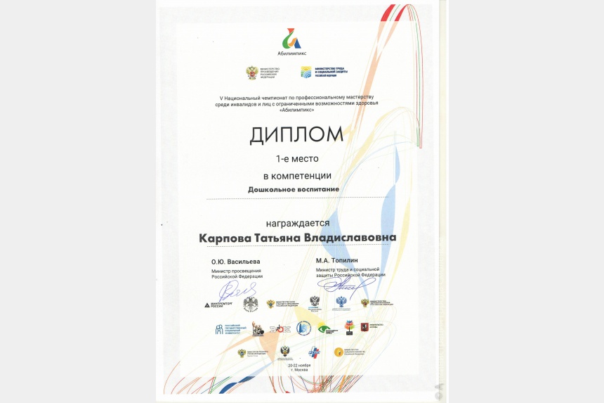 Татьяна Карпова, воспитатель муниципального бюджетного дошкольного образовательного учреждения «Детский сад № 73 «Малыш» города Смоленска, стала победителем в компетенции «Дошкольное воспитание».